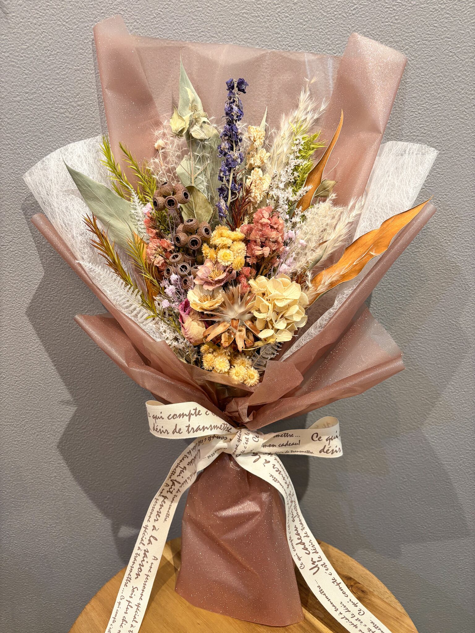 ドライフラワーならではの自然な色合いや、時間とともに変化していく表情もお楽しみください。
